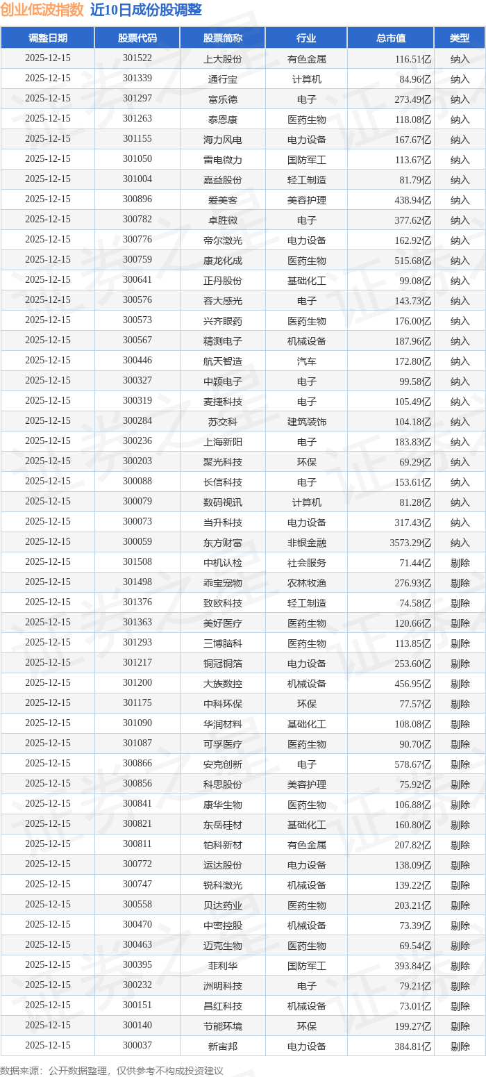 近10日内创业低波(399692)指数成份股做了调整,新纳入了25只股票,剔除了25只股票。