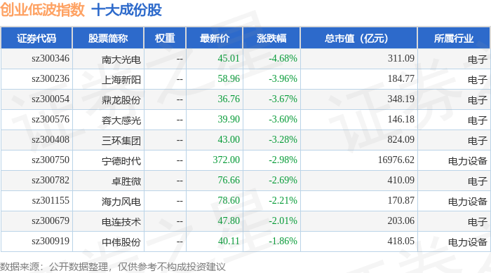 证券之星消息,12月18日,创业低波(399692)指数报收于3790.92点,跌0.18%,成交485.37亿元,换手率1.37%。当日该指数成份股中,上涨的有41家,三诺生物以6.47%的涨幅领涨,下跌的有57家,南大光电以4.68%的跌幅领跌。