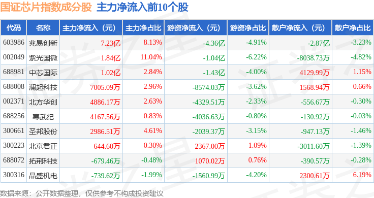 资金流向方面,国证芯片(980017)指数成份股当日主力资金净流出合计6.26亿元,游资资金净流出合计3.15亿元,散户资金净流入合计9.41亿元。成份股资金流向详情见下表: