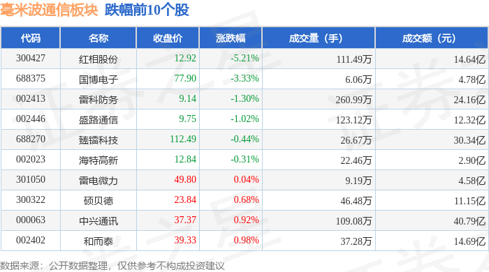 证券之星消息,12月22日毫米波通信板块较上一交易日上涨2.1%,亨通光电领涨。当日上证指数报收于3917.36,上涨0.69%。深证成指报收于13332.73,上涨1.47%。毫米波通信板块个股涨跌见下表: