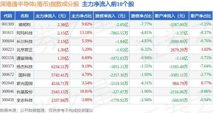 资金流向方面,深港通半导体(港币)(983068)指数成份股当日主力资金净流入合计9802.0万元,游资资金净流出合计6.78亿元,散户资金净流入合计5.8亿元。成份股资金流向详情见下表: