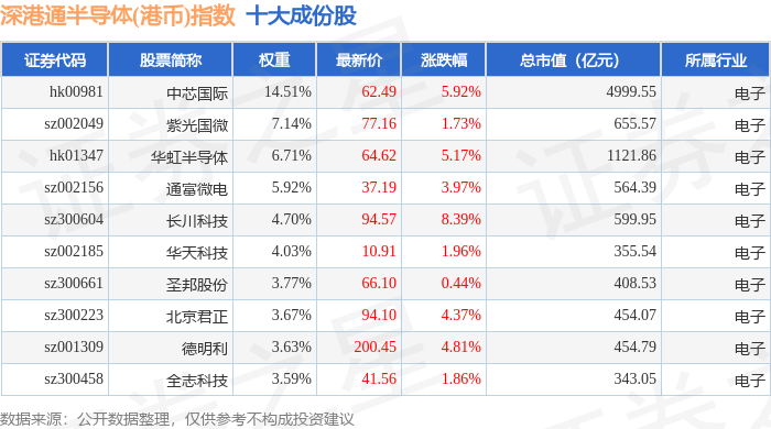 深港通半导体(港币)(983068)指数十大成份股详情如下: