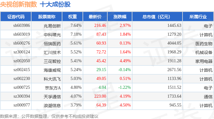 央视创新(399551)指数十大成份股详情如下: