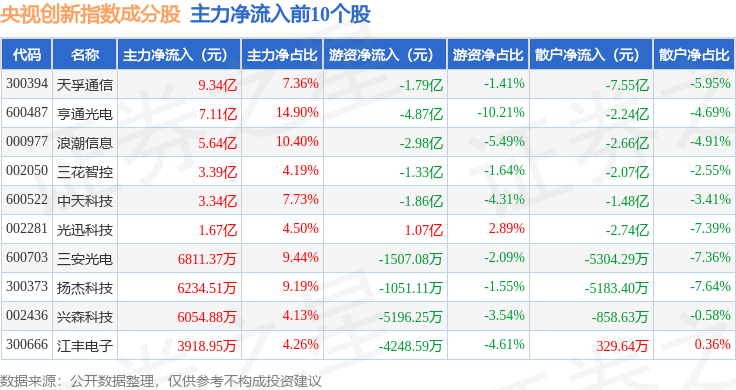 资金流向方面,央视创新(399551)指数成份股当日主力资金净流入合计18.83亿元,游资资金净流出合计8.57亿元,散户资金净流出合计10.26亿元。成份股资金流向详情见下表: