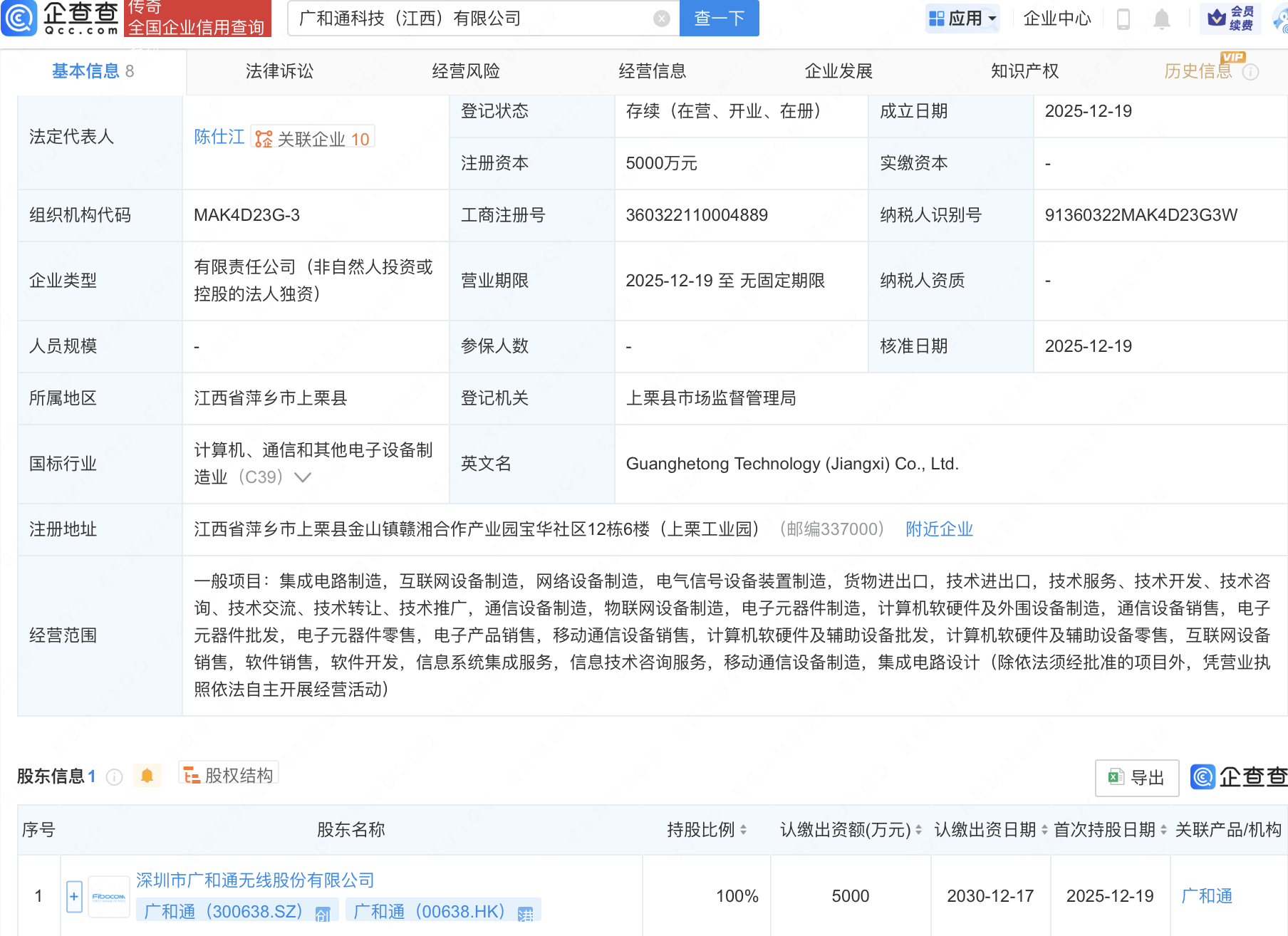 企查查APP显示,近日,广和通科技(江西)有限公司成立,注册资本5000万元,经营范围包含:集成电路制造,互联网设备制造,网络设备制造,电气信号设备装置制造等。企查查股权穿透显示,该公司由广和通(300638)全资持股。