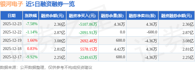 证券之星消息,截至2025年12月23日收盘,银河电子(002519)报收于5.61元,下跌7.58%,换手率15.93%,成交量178.18万手,成交额10.17亿元。