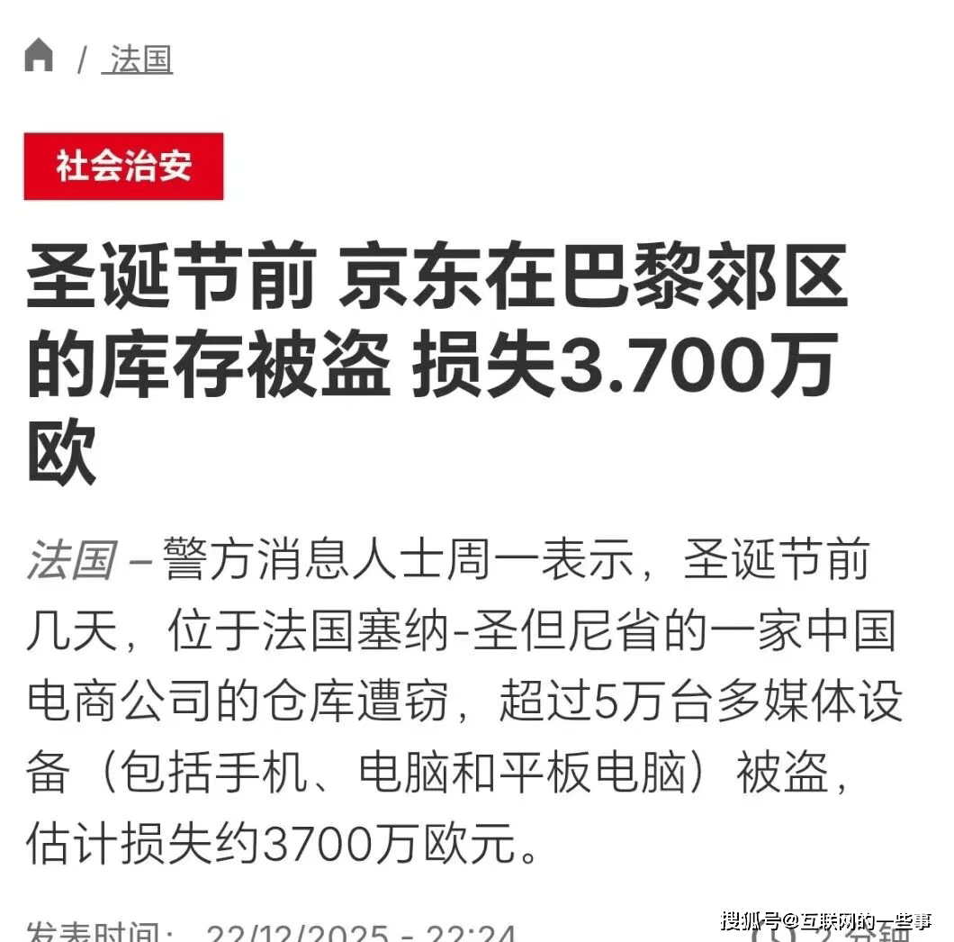 12月22日,京东位于法国巴黎北郊的仓库遭遇了一场计划周密的大盗窃。超过5万件电子设备在一夜之间被洗劫一空,损失金额高达3.06亿元人民币。这起案件被法国警方称为“近年来最大规模的仓库盗窃”。