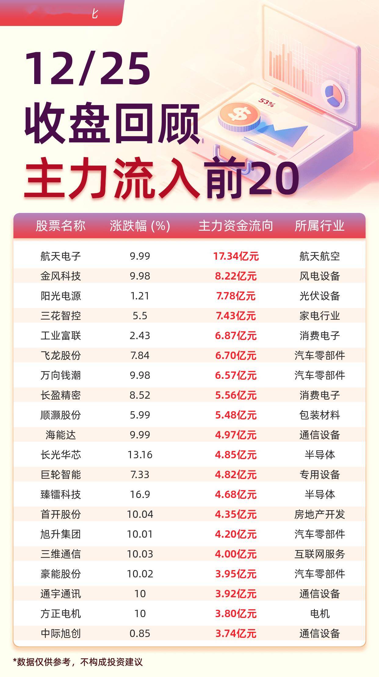 据交易所数据显示,截至12月25日收盘,主力资金流入前20的股票分别为: 航天电子(17.34亿元)、 金风科技(8.22亿元)、 阳光电源(7.78亿元)、 三花智控(7.43亿元)、 工业富联(6.87亿元)、 飞龙股份(6.70亿元)、 万向钱潮(6.57亿元)、 长盈精密(5.56亿元)、 顺灏股份(5.48亿元)、 海能达(4.97亿元)、 长光华芯(4.85亿元)、 巨轮智能(4.82亿元)、 臻镭科技(4.68亿元)、 首开股份(4.35亿元)、 旭升集团(4.20亿元)、 三维通信(4.00亿元)、 豪能股份(3.95亿元)、 通宇通讯(3.92亿元)、 方正电机(3.80亿元)、 中际旭创(3.74亿元)。