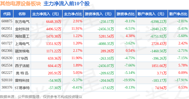 从资金流向上来看,当日其他电源设备板块主力资金净流出11.79亿元,游资资金净流入2.57亿元,散户资金净流入9.21亿元。其他电源设备板块个股资金流向见下表: