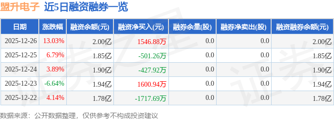 盟升电子融资融券信息显示,融资方面,当日融资买入1.09亿元,融资偿还9308.17万元,融资净买入1546.88万元。融券方面,融券卖出0.0股,融券偿还0.0股,融券余量0.0股,融券余额0.0万元。融资融券余额2.0亿元。