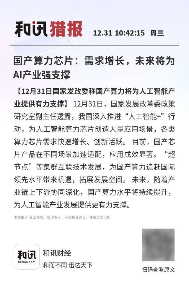 【12月31日国家发改委称国产算力将为人工智能产业提供有力支撑】12月31日,国家发展改革委政策研究室副主任透露,我国深入推进“人工智能+”行动,为人工智能算力芯片创造大量应用场景,各类算力芯片需求快速增长、创新活跃。 目前,国产芯片产品在不同场景加速适配,应用成效显著。“超节点”等集群互联技术发展,为国产算力追赶国际领先水平带来机遇,拓展发展空间。 未来,随着产业链上下游协同深化,国产算力水平将持续提升,为人工智能产业发展提供更有力支撑。