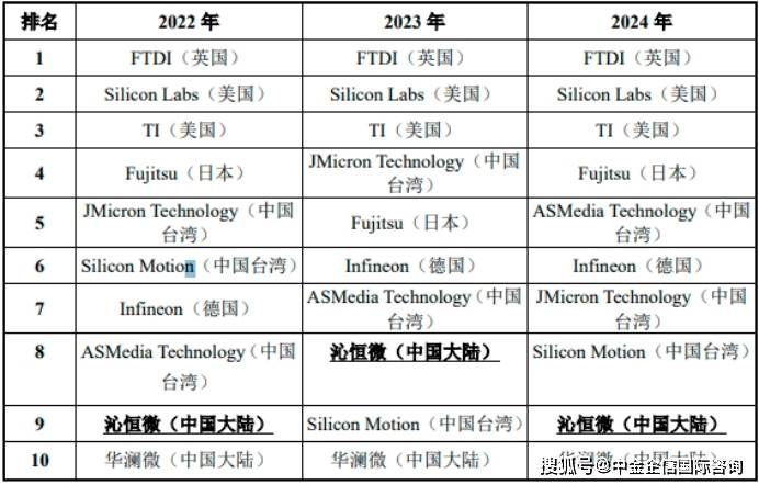 根据中金企信数据,2022-2024年,全球市场主要厂商USB桥接芯片销售收入市场份额排名如下: