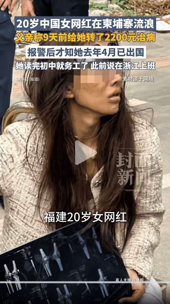 据封面新闻报道,近日,不少网友在社交平台发布“一女网红在柬埔寨街头流浪,且腿部疑似受伤”的视频,引发全网关注。网友们表示,该女子系福建籍网红“umi”,真实姓名吴某桢。