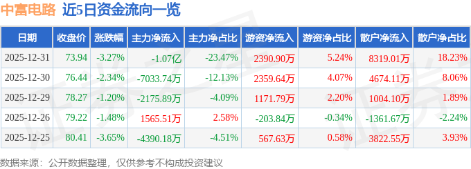 证券之星消息,截至2025年12月31日收盘,中富电路(300814)报收于73.94元,下跌3.27%,换手率3.2%,成交量6.12万手,成交额4.56亿元。
