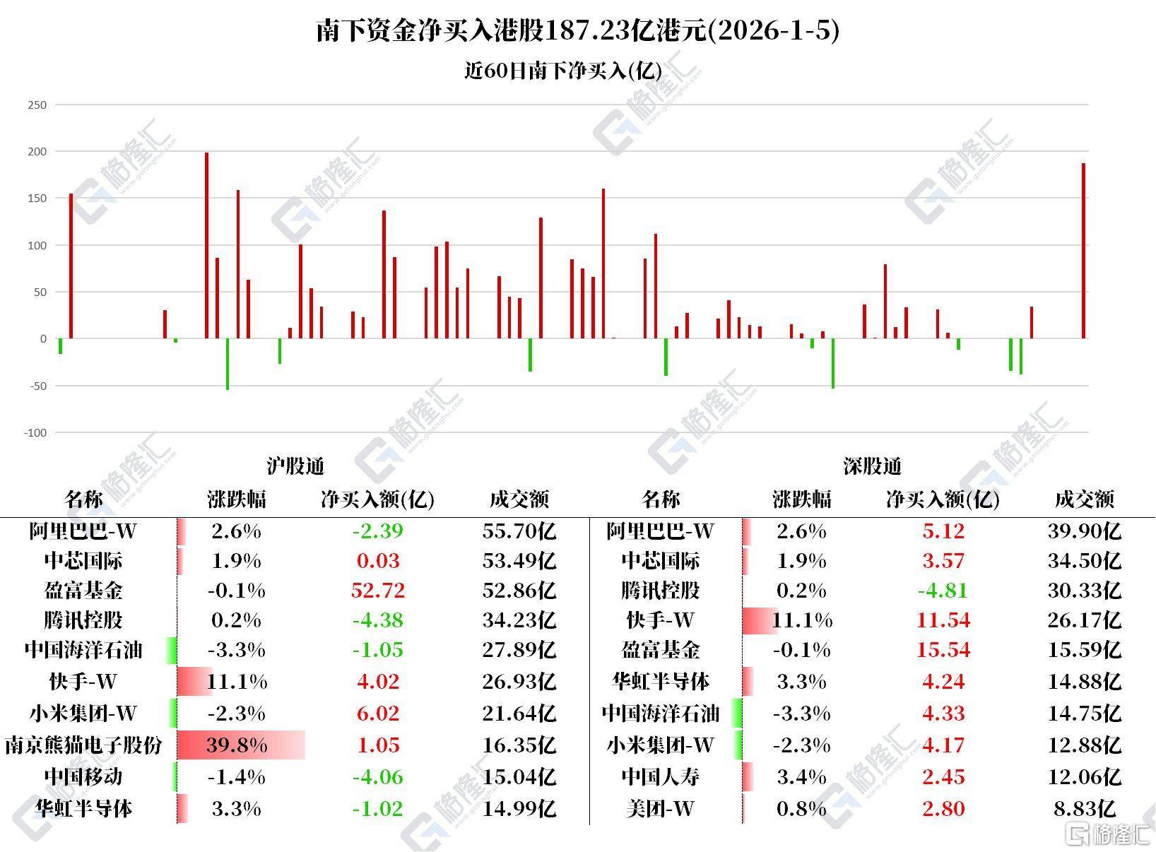 据统计,南下资金已连续6日净卖出腾讯,共计48.6189亿港元;连续5日净买入华虹半导体,共计9.3663亿港元;连续3日净买入中芯国际,共计15.115亿港元;连续3日净买入小米,共计14.8281亿港元。