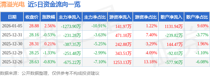 证券之星消息,截至2026年1月5日收盘,清溢光电(688138)报收于28.88元,上涨2.56%,换手率1.29%,成交量4.06万手,成交额1.17亿元。