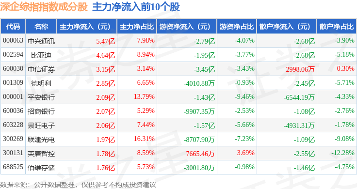 资金流向方面,深企综指(399352)指数成份股当日主力资金净流入合计2626.22万元,游资资金净流出合计10.57亿元,散户资金净流入合计10.63亿元。成份股资金流向详情见下表: