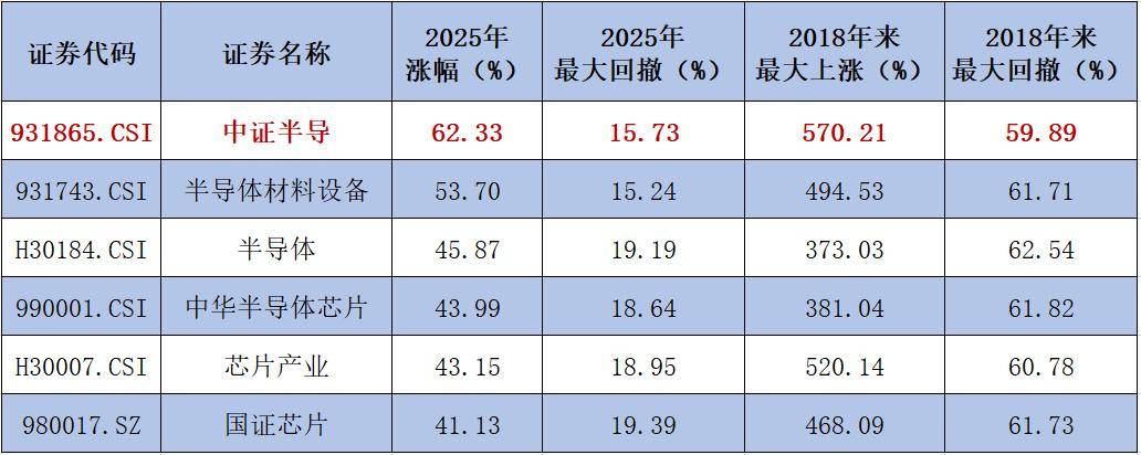 数据显示,中证半导2025年全年上涨62.33%、区间最大涨幅超80%,在中证全指半导体、中华半导体芯片、国证芯片等主流半导体指数中均位列第一,高弹性特征显著。