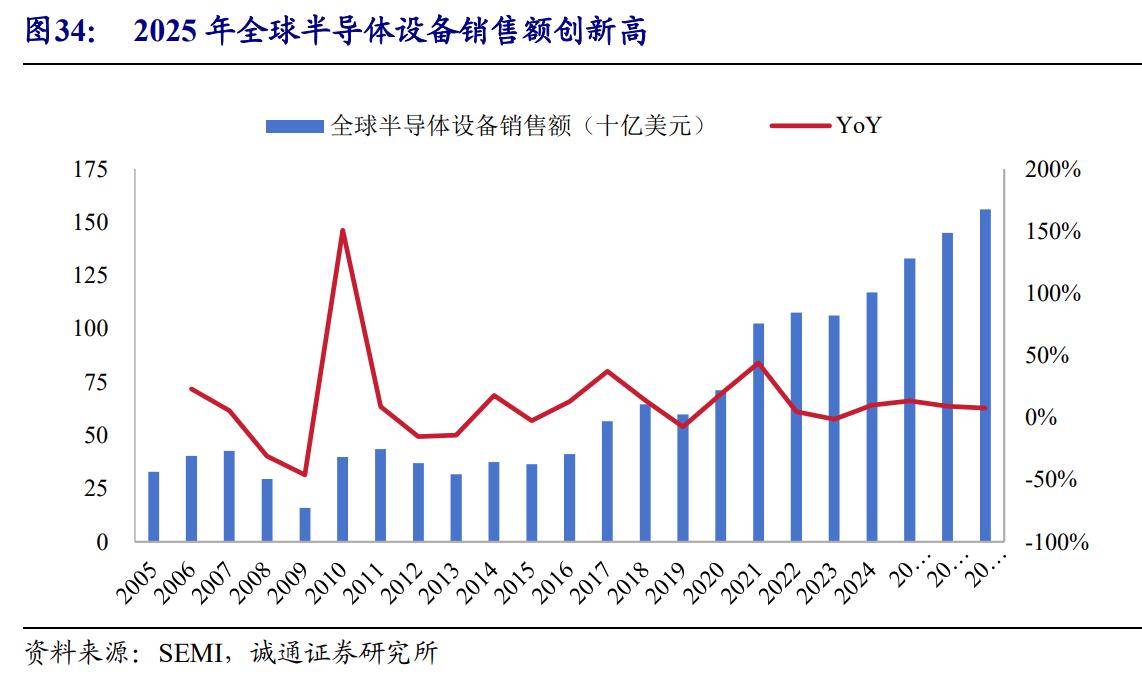 其中上游半导体设备市场规模增长强劲。据国际半导体产业协会(SEMI)最新报告,2025年全球半导体制造设备总销售额预计达1330亿美元,同比增长13.7%,将创历史新高;且增长态势有望持续至未来两年,预计2026年全球半导体设备销售额将达1450亿美元,2027年有望攀升至1560亿美元。