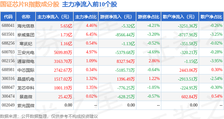 资金流向方面,国证芯片R(480017)指数成份股当日主力资金净流出合计19.38亿元,游资资金净流入合计5.5亿元,散户资金净流入合计13.89亿元。成份股资金流向详情见下表: