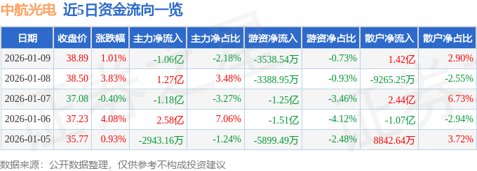 1月9日的资金流向数据方面,主力资金净流出1.06亿元,占总成交额2.18%,游资资金净流出3538.54万元,占总成交额0.73%,散户资金净流入1.42亿元,占总成交额2.9%。