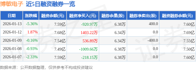 博敏电子融资融券信息显示,融资方面,当日融资买入7375.65万元,融资偿还8296.62万元,融资净偿还920.97万元。融券方面,融券卖出400.0股,融券偿还0.0股,融券余量6.38万股,融券余额78.92万元。融资融券余额7.6亿元。