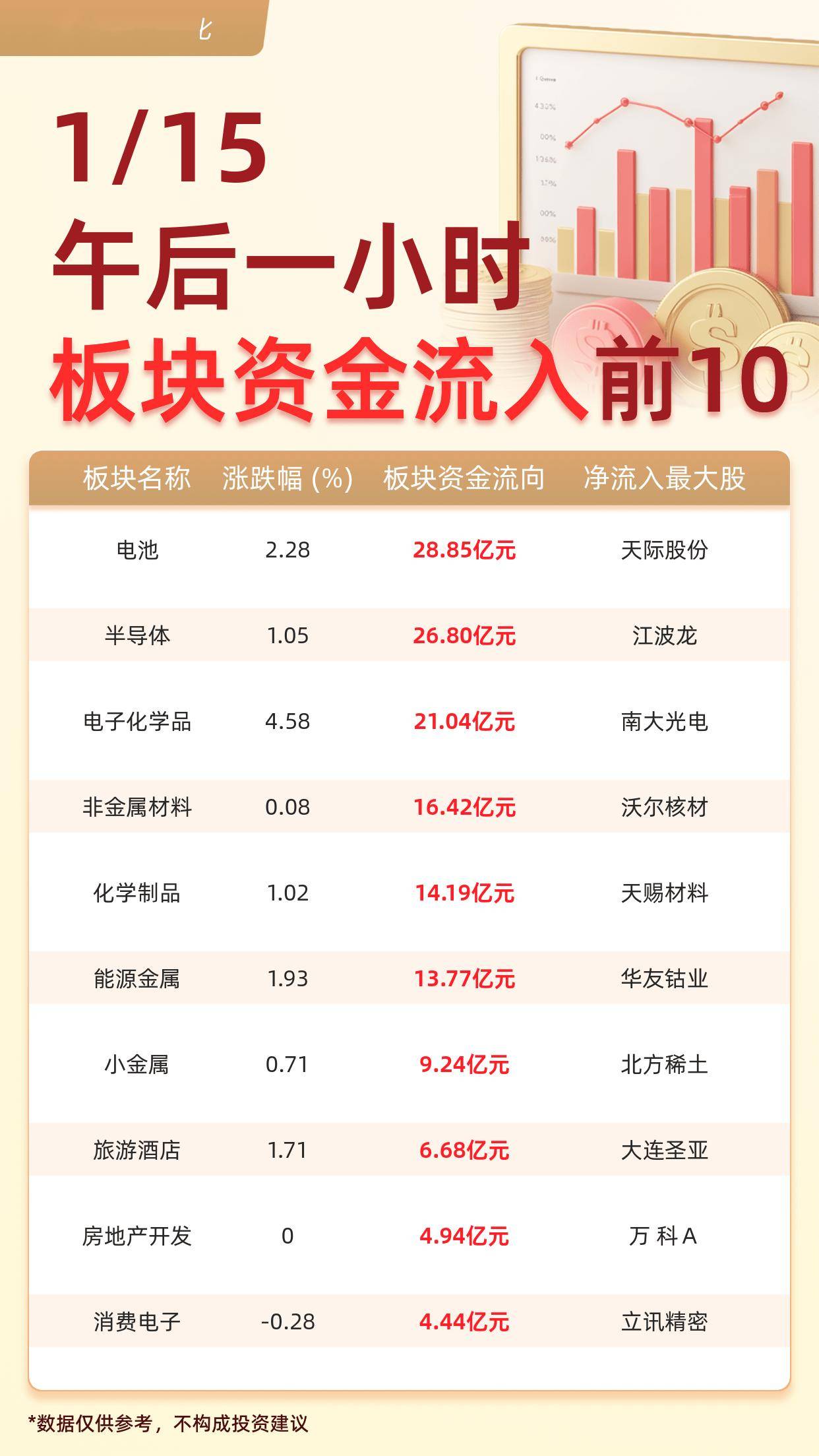 据交易所数据显示,截至1月15日午后一小时,大盘主力资金净流出732.86亿元。主力资金流入前十大板块分别为:电池(28.85亿元)、 半导体(26.80亿元)、电子化学品(21.04亿元)、 非金属材料(16.42亿元)、化学制品(14.19亿元)、 能源金属(13.77亿元)、小金属(9.24亿元)、旅游酒店(6.68亿元)、 房地产开发(4.94亿元)、 消费电子(4.44亿元)。