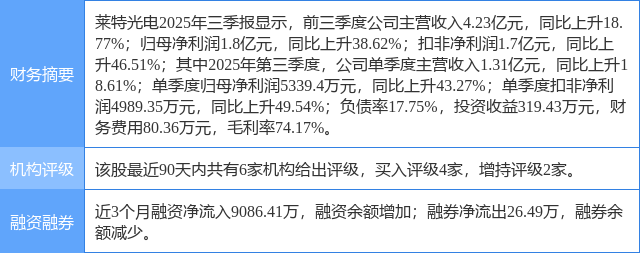 2025年10月28日,开源证券研究员周佳,赵晨旭发布了对莱特光电的研报《中小盘信息更新:2025Q3业绩延续向好态势,公司降本增效成果显著》,该研报对莱特光电给出“买入”评级。研报中预计2025-2027年归母净利润分别为3.07/4.12/6.09亿元,对应EPS分别为0.76/1.02/1.51元,当前股价对应2025-2027年的PE分别为33.7/25.1/17.0倍,看好公司持续受益于下游OLED市场需求攀升以及未来新产品放量,维持“买入”评级。证券之星数据中心根据近三年发布的研报数据计算,该研报作者对此股的盈利预测准确度为63.18%。