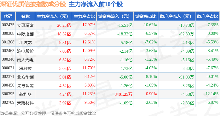 资金流向方面,深证优质信披(970065)指数成份股当日主力资金净流出合计29.78亿元,游资资金净流出合计37.62亿元,散户资金净流入合计67.4亿元。成份股资金流向详情见下表: