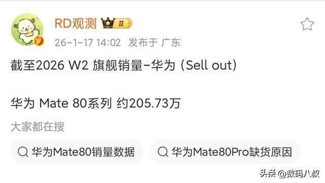 2026年开年的手机市场,被华为Mate80系列的销量神话彻底点燃。最新数据显示,截至2026年第2周,Mate80系列累计销量突破205.73万台,其中单周最高销量达33.73万台,相当于每天狂卖近1.2万台,这样的成绩不仅碾压同期国产旗舰,更创下高端机型最快破200万的纪录。更震撼的是,Mate80标准版激活量已突破150万台,占全系销量超七成,直接登顶国产旗舰单品销量冠军,将小米17Pro等竞品远远甩在身后。