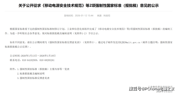 近日,国家工业和信息化部发布了“关于公开征求《移动电源安全技术规范》等2项强制性国家标准(报批稿)意见的公示”,公示时间为2026年1月13日至2026年1月19日。为进一步听取社会各界意见,对标准报批稿及编制说明予以公示。
