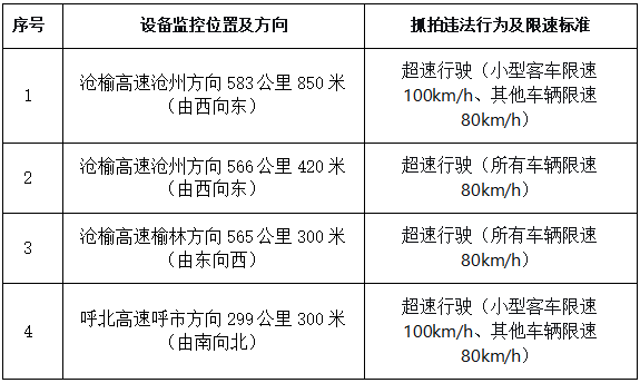 为进一步规范道路交通秩序,有效遏制机动车超速行驶违法行为,保障人民群众出行安全,根据《中华人民共和国道路交通安全法》、《道路交通安全违法行为处理程序规定》等相关法律法规,高速五支队五大队启用4套移动式交通技术监控设备。现将测速地点及记录违法类别向社会通告,具体如下: