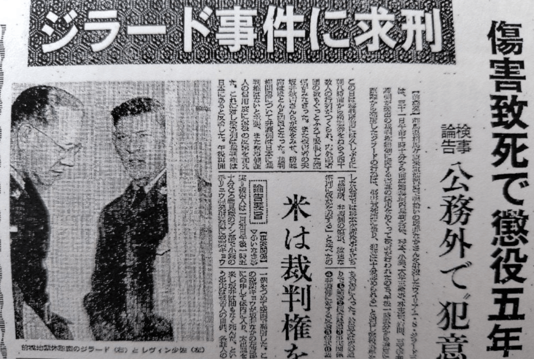 这场案件发生在东京北面的群马县,美军在当地有个基地,尽管表面上基地禁止外人进入,但是依然会有附近的农民跑去靶场附近捡打靶训练剩下的弹壳换钱。结果在57年的1月30日,一名进入靶场捡弹壳的农妇被一名叫吉拉德的士兵,在近距离用未装药的枪榴弹打死,也就是说不可能是流弹误杀。而根据目击者的描述,吉拉德在杀人前还有侮辱性的发言,这更是坐实了他蓄意杀人的事。按正常来说,这种杀人案应该归日本法律管。不过,美日双方都说自己有对吉拉德的审判权。结果,这事儿在日本民间反应非常激烈,日本政府就根据之前美日双方的协议,找到了一个漏洞。日本人说:咱两国协议上白纸黑字写着“如果在美军值勤期间发生这种事,那这事就归美军管,如果不在值勤期间,美军就没有管的权力。”日本政府揪着这点据理力争,最后美军退让。不过,在美国的压力与司法交易下,日本法院给了吉拉德一个判三缓四的处理结果。这在日本民间引发了轩然大波,美国人怎么嘴上是民主和正义,实际上如此无法无天,抗议美军的活动此起彼伏。