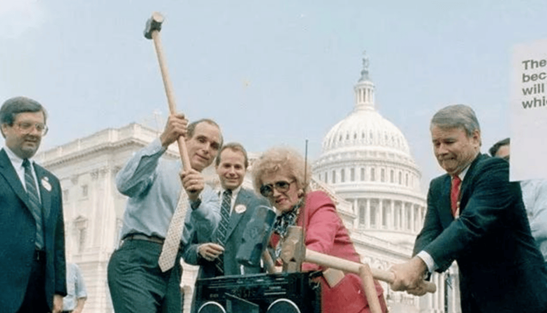 ◇ 图为1987年,美国议员抡起大锤砸毁东芝收音机