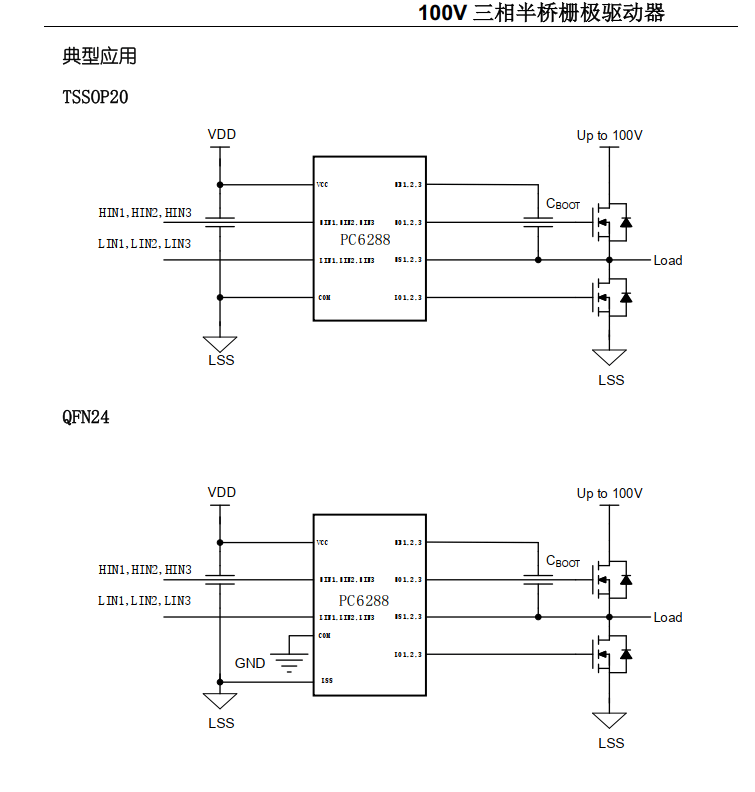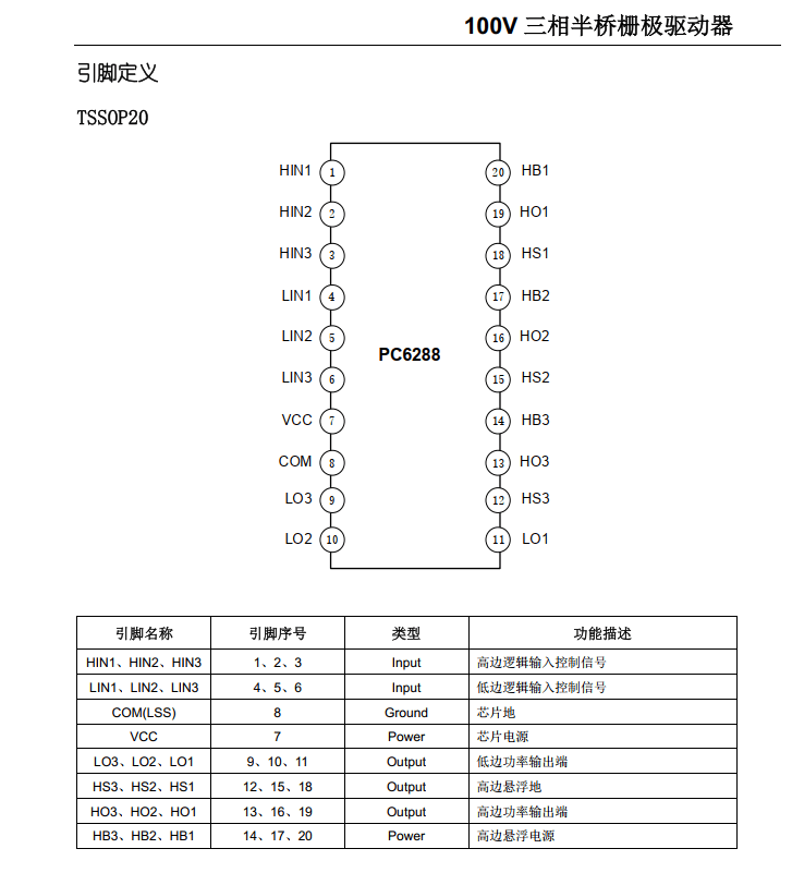 PC6288 是用于功率 MOSFET 和 IGBT的低压、高速半桥栅极驱动器。浮动沟道可用于驱动高边配置的N沟道功率MOSFET 或IGBT,其工作电压 120V。PC6288 集成三路高边和低边施密特输入,三路带有内部自适应死区时间的输出通道,以避免交叉传导。输出模块集成了拉灌平衡电路,系统中与功率管栅极间无需串接电阻和二极管。高低边的输出由输入独立控制,高边设置了欠压保护功能。24 脚封装设置了独立的功率 GND 和逻辑GND 引脚,方便 PCB 走线,减少干扰。