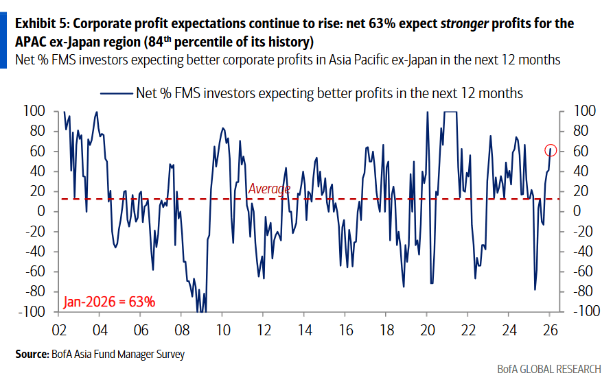 日本以54%的净超配比例继续占据投资者偏好榜首,自2023年10月纳入调查以来,每月都稳居区域首选。投资者正在上调市场回报预期,关注焦点集中在高市政府通过积极投资增长领域来实现经济增长和财政整固的潜在生产力提升政策。