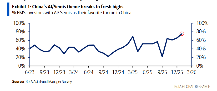 AI和半导体主题在中国市场的主导地位进一步强化,66%的受访者将其列为最青睐主题,创下调查新高。互联网和反内卷主题分别以21%的支持率位列第二。与此同时,83%的受访者预期中国货币政策将进一步宽松,这一比例维持在高位。