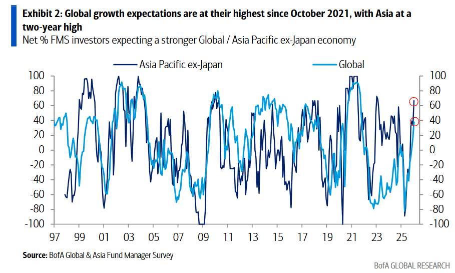 全球增长预期的强化是推动乐观情绪的关键因素。亚太区除日本的经济前景升至两年高点,日本的增长预期则维持在接近调查峰值的水平。在通胀预期保持低位的背景下,亚洲除日本央行保留了维持宽松倾向的空间,这为市场提供了额外的政策支持。
