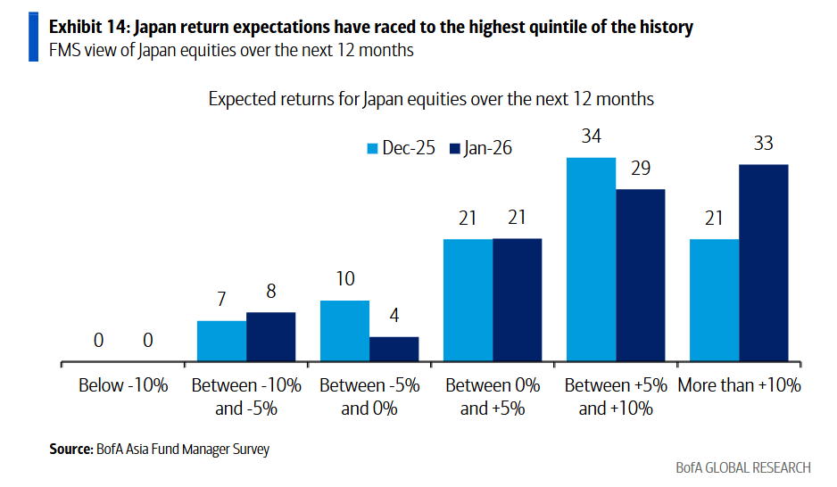 在行业配置上,银行和半导体继续是投资者在日本市场的最爱,分别有50%和38%的受访者超配这两个板块。银行作为利率上升的关键受益者,半导体则是AI投资主题的核心标的。日本市场的回报预期已升至历史最高五分位数,33%的受访者预期未来12个月回报超过10%。