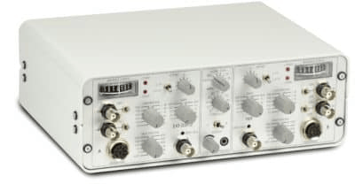 通常情况下,使用带差分输入的前置放大器来记录电生理信号,然后由细胞外放大器进行处理。这确保了对单个神经元以及场电位(例如脑电图 (EEG)、视网膜电图 (ERG) 和心电图 (EKG))的低噪声记录。所有 npi 细胞外放大器均支持交流和/或直流记录,从而为实验人员提供最大的灵活性。内置的 50Hz 或 60Hz 陷波滤波器有助于最大限度地减少电源噪声对信号的失真。