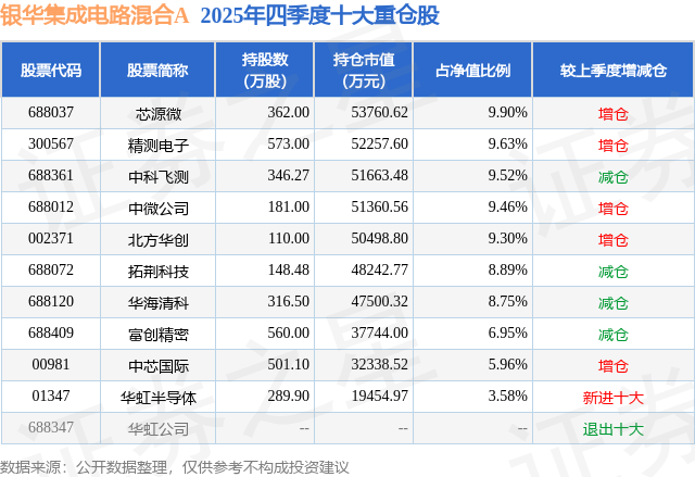根据2025基金年报公募基金重仓股数据,重仓该股的公募基金共8家,其中持有数量最多的公募基金为银华基金的银华集成电路混合A。银华集成电路混合A目前规模为23.54亿元,最新净值1.9819(1月20日),较上一交易日下跌1.21%,近一年上涨100.19%。该公募基金现任基金经理为方建。方建在任的基金产品包括:银华智荟内在价值灵活配置混合发起A,管理时间为2018年6月20日至今,期间收益率为312.05%;银华乐享混合A,管理时间为2021年6月22日至今,期间收益率为16.36%;银华新锐成长混合A,管理时间为2022年3月31日至今,期间收益率为62.71%。