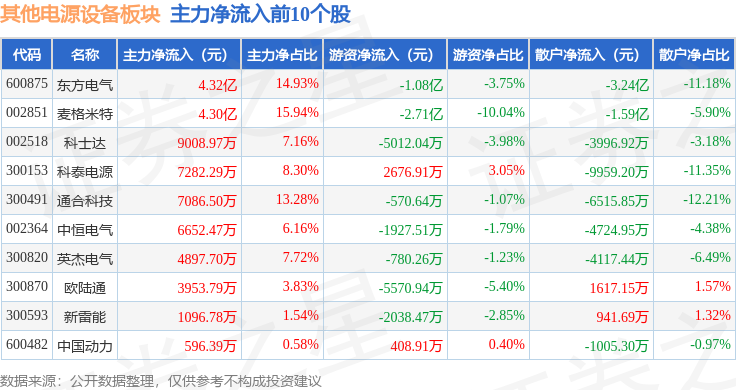 从资金流向上来看,当日其他电源设备板块主力资金净流入7.8亿元,游资资金净流出3.73亿元,散户资金净流出4.07亿元。其他电源设备板块个股资金流向见下表: