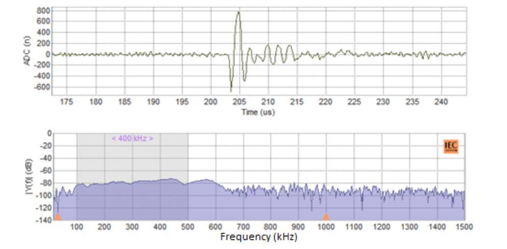 在80kV电压下,电力变压器上测得的真实PD脉冲(上)及其频谱(下),可见其能量主要集中在低频区域