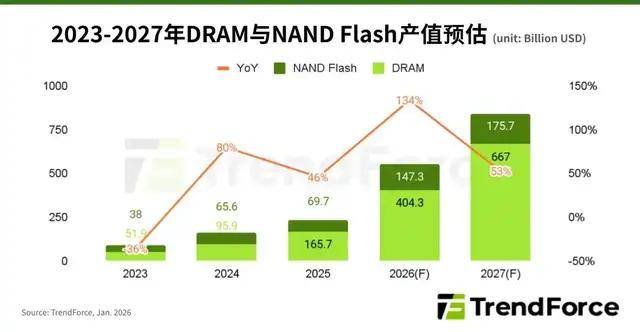 综观整体存储器市场,缺货的市态尚未有缓解的可能,故合约价的话语权仍落在供应商端。展望未来,TrendForce集邦咨询认为,AI浪潮仍在持续进化,从硬件堆栈、系统架构到软件应用皆在同步推进,存储器已是AI运算不可或缺的核心资源。在AI 服务器、高效能运算与企业级储存需求长期支撑下,DRAM与NAND Flash合约价涨势预期将延续至2027年,因此市场的营收成长动能有望延续至2027年。
