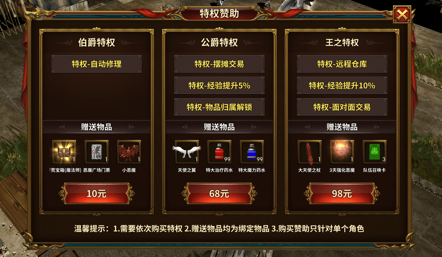 版本同步更新伯爵、公爵、王之三大阶梯式赞助特权,全面覆盖新手起步、战力突破与巅峰制霸各阶段需求。所有赠送道具均为绑定属性,特权需按顺序解锁,且仅对单个角色生效: