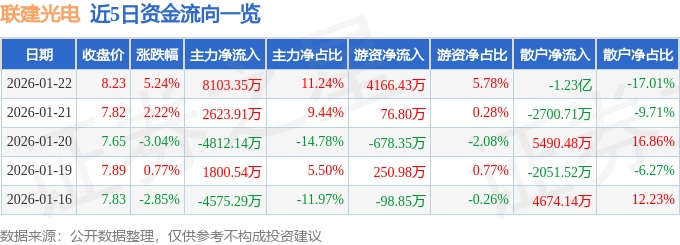 证券之星消息,截至2026年1月22日收盘,联建光电(300269)报收于8.23元,上涨5.24%,换手率16.84%,成交量88.54万手,成交额7.21亿元。