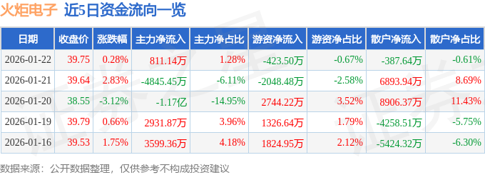 证券之星消息,截至2026年1月22日收盘,火炬电子(603678)报收于39.75元,上涨0.28%,换手率3.35%,成交量15.92万手,成交额6.35亿元。