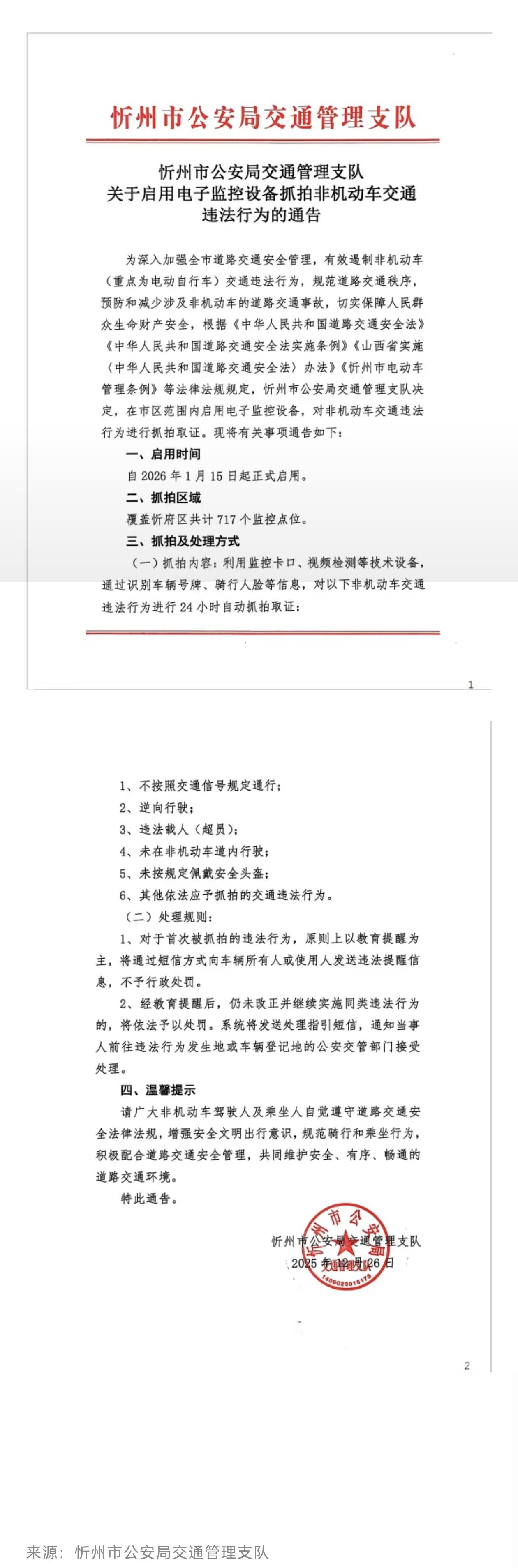 关于启用电子监控设备抓拍非机动车交通违法行为的通告