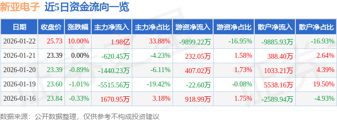 证券之星消息,截至2026年1月22日收盘,新亚电子(605277)报收于25.73元,上涨10.0%,涨停,换手率7.3%,成交量23.23万手,成交额5.84亿元。