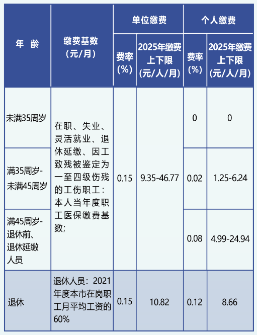 在职职工(含灵活就业、领取失业金人员)及退休延缴人员的缴费费率为0.3%,由用人单位和个人按同比例分担;